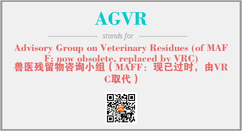 上述内容是“Advisory Group on Veterinary Residues (of MAFF: now obsolete, replaced by VRC)”作为“AGVR”的缩写,解释为“兽医残留物咨询小组(MAFF:现已过时,由VRC取代)”时的信息,以及英文缩略词AGVR所代表的英文单词,其对应的中文拼音、详细解释以及在英文中的流行度和相关分类、应用领域及应用示例等。