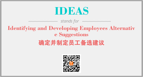 上述内容是“Identifying and Developing Employees Alternative Suggestions”作为“IDEAS”的缩写,解释为“确定并制定员工备选建议”时的信息,以及英文缩略词IDEAS所代表的英文单词,其对应的中文拼音、详细解释以及在英文中的流行度和相关分类、应用领域及应用示例等。