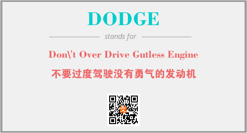 上述内容是“Don\'t Over Drive Gutless Engine”作为“DODGE”的缩写,解释为“不要过度驾驶没有勇气的发动机”时的信息,以及英文缩略词DODGE所代表的英文单词,其对应的中文拼音、详细解释以及在英文中的流行度和相关分类、应用领域及应用示例等。