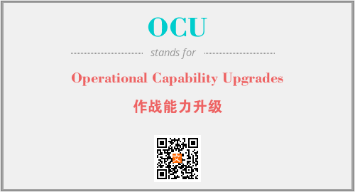 英文缩略词“OCU”经常作为“Operational Capability Upgrades”的英文缩写来使用,中文表示:“作战能力升级”。本文将详细介绍英文缩写词OCU所代表英文单词,其对应的中文拼音、详细解释以及在英语中的流行度。此外,还有关于缩略词OCU的分类、应用领域及相关应用示例等。