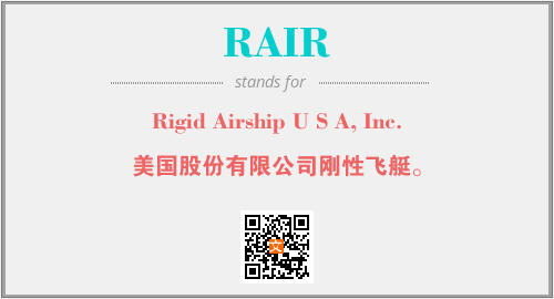 上述内容是“Rigid Airship U S A, Inc.”作为“RAIR”的缩写,解释为“美国股份有限公司刚性飞艇。”时的信息,以及英文缩略词RAIR所代表的英文单词,其对应的中文拼音、详细解释以及在英文中的流行度和相关分类、应用领域及应用示例等。