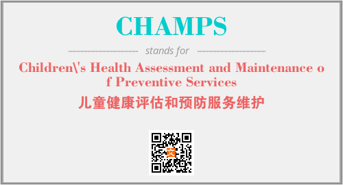 上述内容是“Children\'s Health Assessment and Maintenance of Preventive Services”作为“CHAMPS”的缩写,解释为“儿童健康评估和预防服务维护”时的信息,以及英文缩略词CHAMPS所代表的英文单词,其对应的中文拼音、详细解释以及在英文中的流行度和相关分类、应用领域及应用示例等。