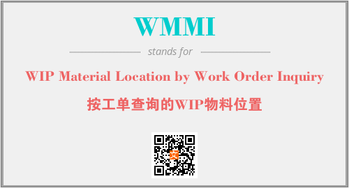 英文缩略词“WMMI”经常作为“WIP Material Location by Work Order Inquiry”的英文缩写来使用,中文表示:“按工单查询的WIP物料位置”。本文将详细介绍英文缩写词WMMI所代表英文单词,其对应的中文拼音、详细解释以及在英语中的流行度。此外,还有关于缩略词WMMI的分类、应用领域及相关应用示例等。