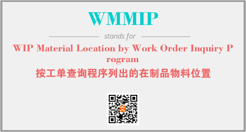 英文缩略词“WMMIP”经常作为“WIP Material Location by Work Order Inquiry Program”的英文缩写来使用,中文表示:“按工单查询程序列出的在制品物料位置”。本文将详细介绍英文缩写词WMMIP所代表英文单词,其对应的中文拼音、详细解释以及在英语中的流行度。此外,还有关于缩略词WMMIP的分类、应用领域及相关应用示例等。