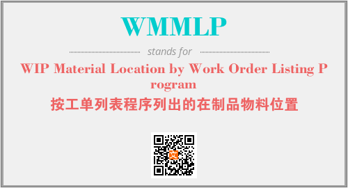 英文缩略词“WMMLP”经常作为“WIP Material Location by Work Order Listing Program”的英文缩写来使用,中文表示:“按工单列表程序列出的在制品物料位置”。本文将详细介绍英文缩写词WMMLP所代表英文单词,其对应的中文拼音、详细解释以及在英语中的流行度。此外,还有关于缩略词WMMLP的分类、应用领域及相关应用示例等。