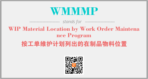 上述内容是“WIP Material Location by Work Order Maintenance Program”作为“WMMMP”的缩写,解释为“按工单维护计划列出的在制品物料位置”时的信息,以及英文缩略词WMMMP所代表的英文单词,其对应的中文拼音、详细解释以及在英文中的流行度和相关分类、应用领域及应用示例等。