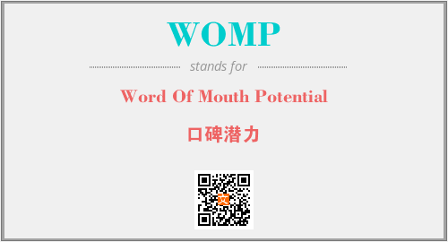 上述内容是“Word Of Mouth Potential”作为“WOMP”的缩写,解释为“口碑潜力”时的信息,以及英文缩略词WOMP所代表的英文单词,其对应的中文拼音、详细解释以及在英文中的流行度和相关分类、应用领域及应用示例等。