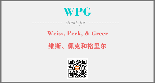 上述内容是“Weiss, Peck, & Greer”作为“WPG”的缩写,解释为“维斯、佩克和格里尔”时的信息,以及英文缩略词WPG所代表的英文单词,其对应的中文拼音、详细解释以及在英文中的流行度和相关分类、应用领域及应用示例等。