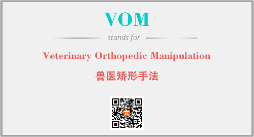 上述内容是“Veterinary Orthopedic Manipulation”作为“VOM”的缩写,解释为“兽医矫形手法”时的信息,以及英文缩略词VOM所代表的英文单词,其对应的中文拼音、详细解释以及在英文中的流行度和相关分类、应用领域及应用示例等。