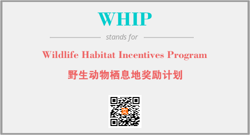 上述内容是“Wildlife Habitat Incentives Program”作为“WHIP”的缩写,解释为“野生动物栖息地奖励计划”时的信息,以及英文缩略词WHIP所代表的英文单词,其对应的中文拼音、详细解释以及在英文中的流行度和相关分类、应用领域及应用示例等。