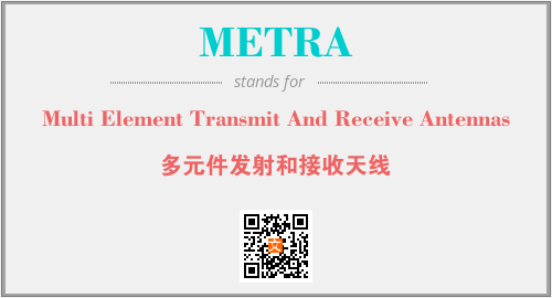 英文缩略词“METRA”经常作为“Multi Element Transmit And Receive Antennas”的英文缩写来使用,中文表示:“多元件发射和接收天线”。本文将详细介绍英文缩写词METRA所代表英文单词,其对应的中文拼音、详细解释以及在英语中的流行度。此外,还有关于缩略词METRA的分类、应用领域及相关应用示例等。