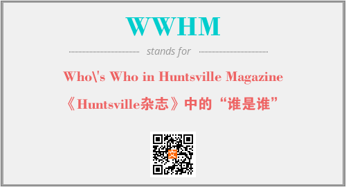 上述内容是“Who\'s Who in Huntsville Magazine”作为“WWHM”的缩写,解释为“《Huntsville杂志》中的“谁是谁””时的信息,以及英文缩略词WWHM所代表的英文单词,其对应的中文拼音、详细解释以及在英文中的流行度和相关分类、应用领域及应用示例等。
