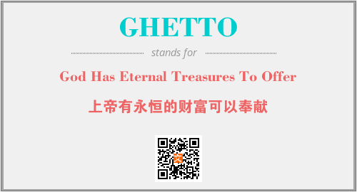 上述内容是“God Has Eternal Treasures To Offer”作为“GHETTO”的缩写,解释为“上帝有永恒的财富可以奉献”时的信息,以及英文缩略词GHETTO所代表的英文单词,其对应的中文拼音、详细解释以及在英文中的流行度和相关分类、应用领域及应用示例等。