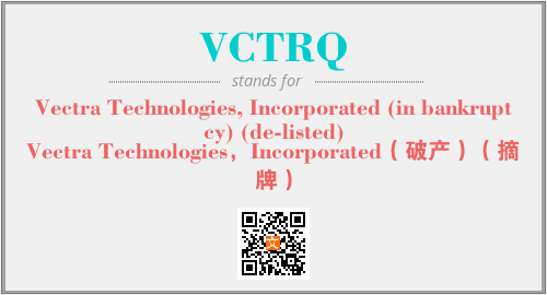 上述内容是“Vectra Technologies, Incorporated (in bankruptcy) (de-listed)”作为“VCTRQ”的缩写,解释为“Vectra Technologies,Incorporated(破产)(摘牌)”时的信息,以及英文缩略词VCTRQ所代表的英文单词,其对应的中文拼音、详细解释以及在英文中的流行度和相关分类、应用领域及应用示例等。