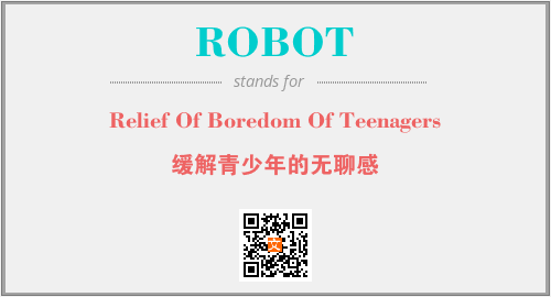 英文缩略词“ROBOT”经常作为“Relief Of Boredom Of Teenagers”的英文缩写来使用,中文表示:“缓解青少年的无聊感”。本文将详细介绍英文缩写词ROBOT所代表英文单词,其对应的中文拼音、详细解释以及在英语中的流行度。此外,还有关于缩略词ROBOT的分类、应用领域及相关应用示例等。