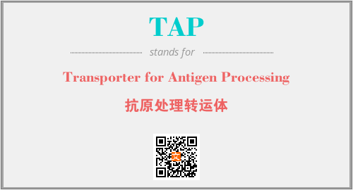 上述内容是“Transporter for Antigen Processing”作为“TAP”的缩写,解释为“抗原处理转运体”时的信息,以及英文缩略词TAP所代表的英文单词,其对应的中文拼音、详细解释以及在英文中的流行度和相关分类、应用领域及应用示例等。