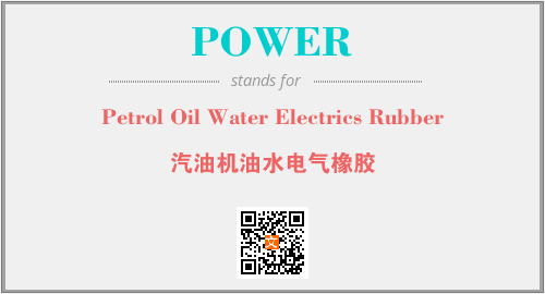 上述内容是“Petrol Oil Water Electrics Rubber”作为“POWER”的缩写,解释为“汽油机油水电气橡胶”时的信息,以及英文缩略词POWER所代表的英文单词,其对应的中文拼音、详细解释以及在英文中的流行度和相关分类、应用领域及应用示例等。