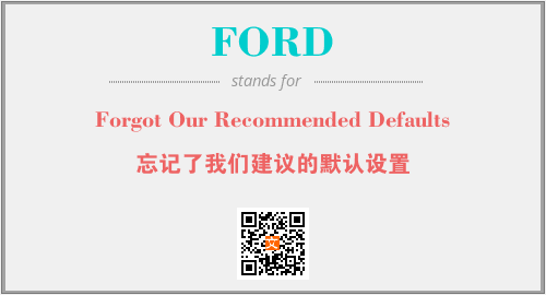 上述内容是“Forgot Our Recommended Defaults”作为“FORD”的缩写,解释为“忘记了我们建议的默认设置”时的信息,以及英文缩略词FORD所代表的英文单词,其对应的中文拼音、详细解释以及在英文中的流行度和相关分类、应用领域及应用示例等。