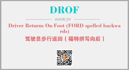 上述内容是“Driver Returns On Foot (FORD spelled backwards)”作为“DROF”的缩写,解释为“驾驶员步行返回(福特拼写向后)”时的信息,以及英文缩略词DROF所代表的英文单词,其对应的中文拼音、详细解释以及在英文中的流行度和相关分类、应用领域及应用示例等。