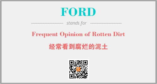 英文缩略词“FORD”经常作为“Frequent Opinion of Rotten Dirt”的英文缩写来使用,中文表示:“经常看到腐烂的泥土”。本文将详细介绍英文缩写词FORD所代表英文单词,其对应的中文拼音、详细解释以及在英语中的流行度。此外,还有关于缩略词FORD的分类、应用领域及相关应用示例等。