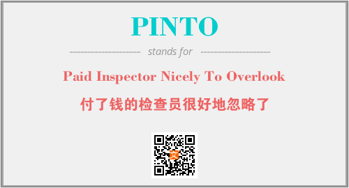 上述内容是“Paid Inspector Nicely To Overlook”作为“PINTO”的缩写,解释为“付了钱的检查员很好地忽略了”时的信息,以及英文缩略词PINTO所代表的英文单词,其对应的中文拼音、详细解释以及在英文中的流行度和相关分类、应用领域及应用示例等。
