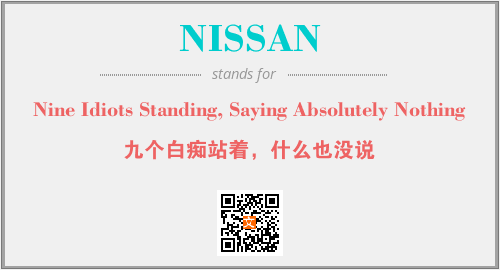 上述内容是“Nine Idiots Standing, Saying Absolutely Nothing”作为“NISSAN”的缩写,解释为“九个白痴站着,什么也没说”时的信息,以及英文缩略词NISSAN所代表的英文单词,其对应的中文拼音、详细解释以及在英文中的流行度和相关分类、应用领域及应用示例等。