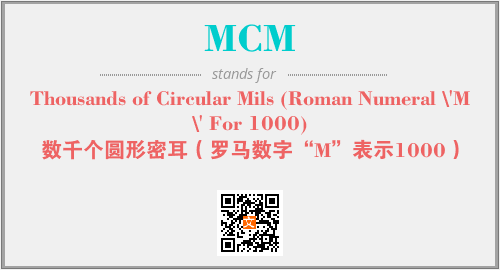 上述内容是“Thousands of Circular Mils (Roman Numeral \'M\' For 1000)”作为“MCM”的缩写,解释为“数千个圆形密耳(罗马数字“M”表示1000)”时的信息,以及英文缩略词MCM所代表的英文单词,其对应的中文拼音、详细解释以及在英文中的流行度和相关分类、应用领域及应用示例等。