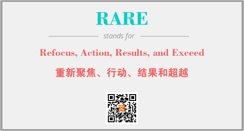 上述内容是“Refocus, Action, Results, and Exceed”作为“RARE”的缩写,解释为“重新聚焦、行动、结果和超越”时的信息,以及英文缩略词RARE所代表的英文单词,其对应的中文拼音、详细解释以及在英文中的流行度和相关分类、应用领域及应用示例等。