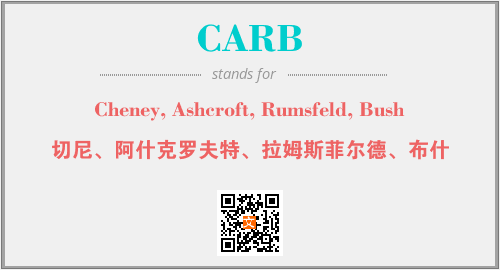 上述内容是“Cheney, Ashcroft, Rumsfeld, Bush”作为“CARB”的缩写,解释为“切尼、阿什克罗夫特、拉姆斯菲尔德、布什”时的信息,以及英文缩略词CARB所代表的英文单词,其对应的中文拼音、详细解释以及在英文中的流行度和相关分类、应用领域及应用示例等。
