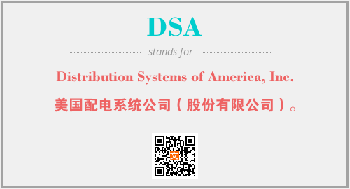 上述内容是“Distribution Systems of America, Inc.”作为“DSA”的缩写,解释为“美国配电系统公司(股份有限公司)。”时的信息,以及英文缩略词DSA所代表的英文单词,其对应的中文拼音、详细解释以及在英文中的流行度和相关分类、应用领域及应用示例等。
