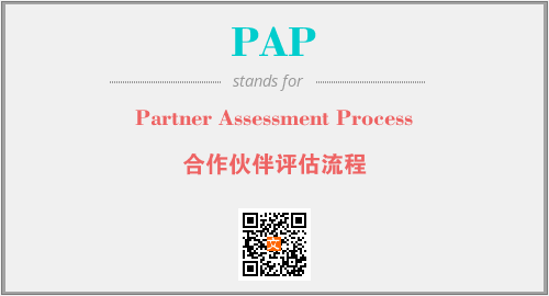 上述内容是“Partner Assessment Process”作为“PAP”的缩写,解释为“合作伙伴评估流程”时的信息,以及英文缩略词PAP所代表的英文单词,其对应的中文拼音、详细解释以及在英文中的流行度和相关分类、应用领域及应用示例等。