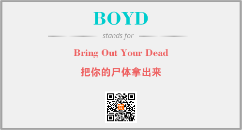 上述内容是“Bring Out Your Dead”作为“BOYD”的缩写,解释为“把你的尸体拿出来”时的信息,以及英文缩略词BOYD所代表的英文单词,其对应的中文拼音、详细解释以及在英文中的流行度和相关分类、应用领域及应用示例等。