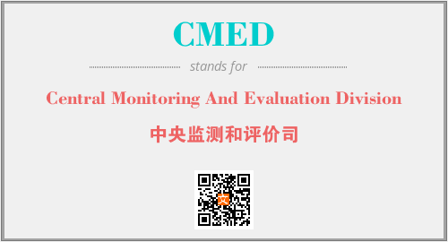 上述内容是“Central Monitoring And Evaluation Division”作为“CMED”的缩写,解释为“中央监测和评价司”时的信息,以及英文缩略词CMED所代表的英文单词,其对应的中文拼音、详细解释以及在英文中的流行度和相关分类、应用领域及应用示例等。