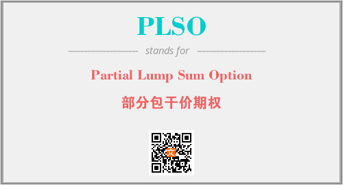 上述内容是“Partial Lump Sum Option”作为“PLSO”的缩写,解释为“部分包干价期权”时的信息,以及英文缩略词PLSO所代表的英文单词,其对应的中文拼音、详细解释以及在英文中的流行度和相关分类、应用领域及应用示例等。