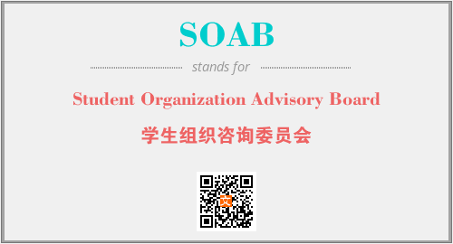 以上为Student Organization Advisory Board英文缩略词SOAB的中文解释,以及该英文缩写在英语的流行度、分类和应用领域方面的信息。