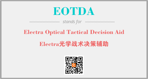 上述内容是“Electra Optical Tactical Decision Aid”作为“EOTDA”的缩写,解释为“Electra光学战术决策辅助”时的信息,以及英文缩略词EOTDA所代表的英文单词,其对应的中文拼音、详细解释以及在英文中的流行度和相关分类、应用领域及应用示例等。