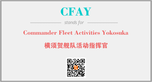 英文缩略词“CFAY”经常作为“Commander Fleet Activities Yokosuka”的英文缩写来使用,中文表示:“横须贺舰队活动指挥官”。本文将详细介绍英文缩写词CFAY所代表英文单词,其对应的中文拼音、详细解释以及在英语中的流行度。此外,还有关于缩略词CFAY的分类、应用领域及相关应用示例等。