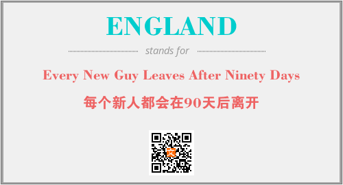 上述内容是“Every New Guy Leaves After Ninety Days”作为“ENGLAND”的缩写,解释为“每个新人都会在90天后离开”时的信息,以及英文缩略词ENGLAND所代表的英文单词,其对应的中文拼音、详细解释以及在英文中的流行度和相关分类、应用领域及应用示例等。