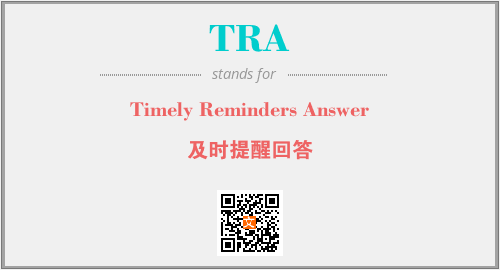 上述内容是“Timely Reminders Answer”作为“TRA”的缩写,解释为“及时提醒回答”时的信息,以及英文缩略词TRA所代表的英文单词,其对应的中文拼音、详细解释以及在英文中的流行度和相关分类、应用领域及应用示例等。