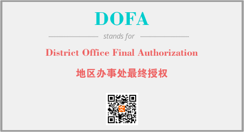 英文缩略词“DOFA”经常作为“District Office Final Authorization”的英文缩写来使用,中文表示:“地区办事处最终授权”。本文将详细介绍英文缩写词DOFA所代表英文单词,其对应的中文拼音、详细解释以及在英语中的流行度。此外,还有关于缩略词DOFA的分类、应用领域及相关应用示例等。