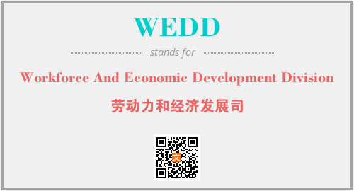 上述内容是“Workforce And Economic Development Division”作为“WEDD”的缩写,解释为“劳动力和经济发展司”时的信息,以及英文缩略词WEDD所代表的英文单词,其对应的中文拼音、详细解释以及在英文中的流行度和相关分类、应用领域及应用示例等。