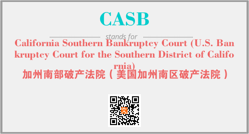 英文缩略词“CASB”经常作为“California Southern Bankruptcy Court (U.S. Bankruptcy Court for the Southern District of California)”的英文缩写来使用,中文表示:“加州南部破产法院(美国加州南区破产法院)”。本文将详细介绍英文缩写词CASB所代表英文单词,其对应的中文拼音、详细解释以及在英语中的流行度。此外,还有关于缩略词CASB的分类、应用领域及相关应用示例等。