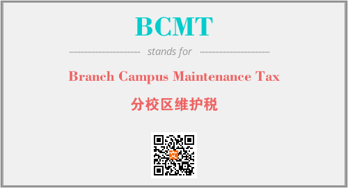 英文缩略词“BCMT”经常作为“Branch Campus Maintenance Tax”的英文缩写来使用,中文表示:“分校区维护税”。本文将详细介绍英文缩写词BCMT所代表英文单词,其对应的中文拼音、详细解释以及在英语中的流行度。此外,还有关于缩略词BCMT的分类、应用领域及相关应用示例等。