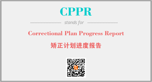 上述内容是“Correctional Plan Progress Report”作为“CPPR”的缩写,解释为“矫正计划进度报告”时的信息,以及英文缩略词CPPR所代表的英文单词,其对应的中文拼音、详细解释以及在英文中的流行度和相关分类、应用领域及应用示例等。