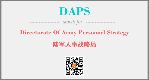 英文缩略词“DAPS”经常作为“Directorate Of Army Personnel Strategy”的英文缩写来使用,中文表示:“陆军人事战略局”。本文将详细介绍英文缩写词DAPS所代表英文单词,其对应的中文拼音、详细解释以及在英语中的流行度。此外,还有关于缩略词DAPS的分类、应用领域及相关应用示例等。