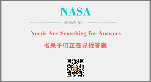 英文缩略词“NASA”经常作为“Nerds Are Searching for Answers”的英文缩写来使用,中文表示:“书呆子们正在寻找答案”。本文将详细介绍英文缩写词NASA所代表英文单词,其对应的中文拼音、详细解释以及在英语中的流行度。此外,还有关于缩略词NASA的分类、应用领域及相关应用示例等。