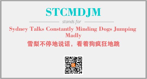 上述内容是“Sydney Talks Constantly Minding Dogs Jumping Madly”作为“STCMDJM”的缩写,解释为“雪梨不停地说话,看着狗疯狂地跳”时的信息,以及英文缩略词STCMDJM所代表的英文单词,其对应的中文拼音、详细解释以及在英文中的流行度和相关分类、应用领域及应用示例等。