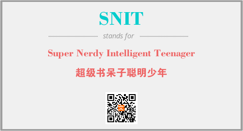 上述内容是“Super Nerdy Intelligent Teenager”作为“SNIT”的缩写,解释为“超级书呆子聪明少年”时的信息,以及英文缩略词SNIT所代表的英文单词,其对应的中文拼音、详细解释以及在英文中的流行度和相关分类、应用领域及应用示例等。