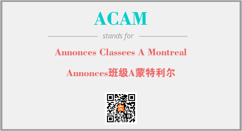 英文缩略词“ACAM”经常作为“Annonces Classees A Montreal”的英文缩写来使用,中文表示:“Annonces班级A蒙特利尔”。本文将详细介绍英文缩写词ACAM所代表英文单词,其对应的中文拼音、详细解释以及在英语中的流行度。此外,还有关于缩略词ACAM的分类、应用领域及相关应用示例等。