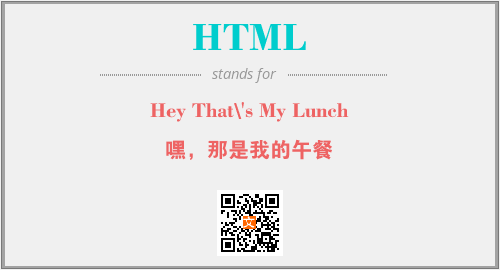 上述内容是“Hey That\'s My Lunch”作为“HTML”的缩写,解释为“嘿,那是我的午餐”时的信息,以及英文缩略词HTML所代表的英文单词,其对应的中文拼音、详细解释以及在英文中的流行度和相关分类、应用领域及应用示例等。